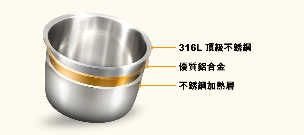 內鍋採用 SUS 316L 頂級不銹鋼製成,結構強度高而且密集,有效抵抗長期刮擦,同時令米粒接觸內膽面積減少,米粒做到不黏內膽底部,耐刮耐用,帶來持久的烹飪體驗。
