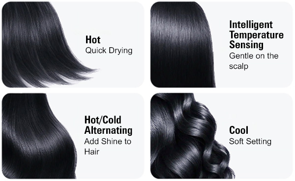 The Hot & Cold Alternating Mode was developed to switch the airflow between hot air and cold air automatically. This temperature gap will mitigate waves, line up the surface of the hair, and reflect light to add luster.