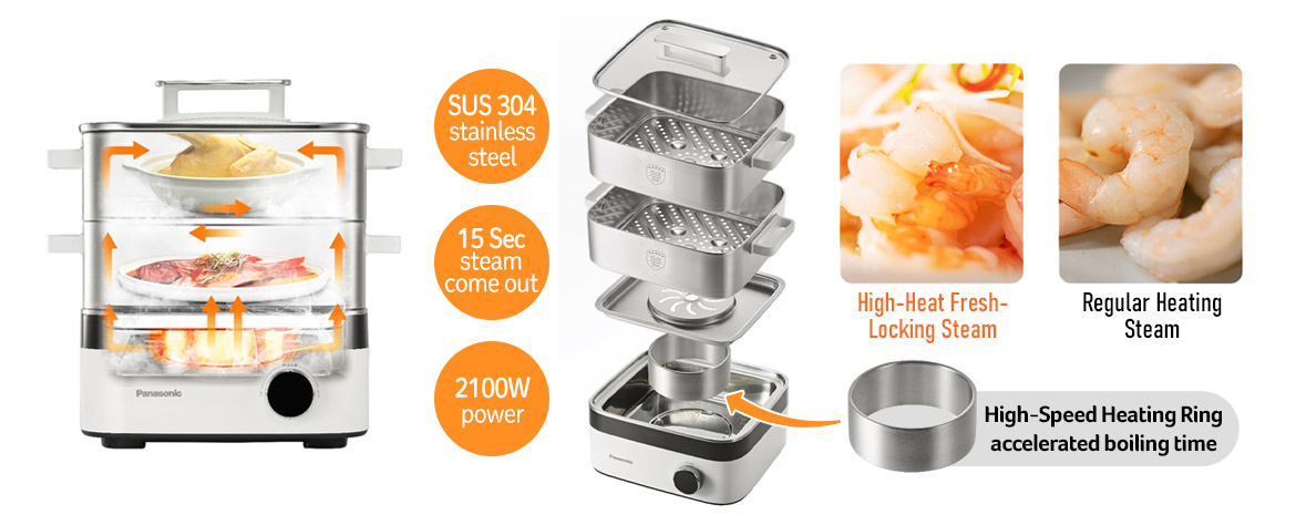 The high-speed heating ring technology and 2100W power deliver a rapid temperature rise for quicker cooking. Steam released in 15 seconds with High-Speed heating wing; steams above, stews below, assists in easy cooking.