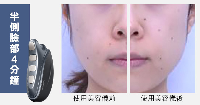 【測試方法】一次使用,使用面部凝膠及 W EMS LIFT模式,對半邊臉部進行 4 分鐘的護理。使用後,沖洗面部凝膠。