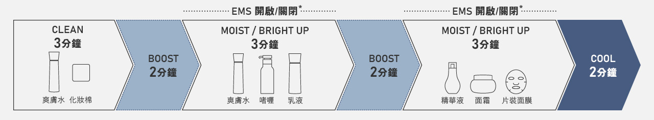 Power Boost 脈衝在約 3 秒內開闢讓美容成分滲透至角質層的通道,促進大分子美容成分滲透至角質層。RED LED 同時進行光療護理。使用「BOOST 模式」後,請立即進行 MOIST 或 BRIGHT UP 模式進行護理。